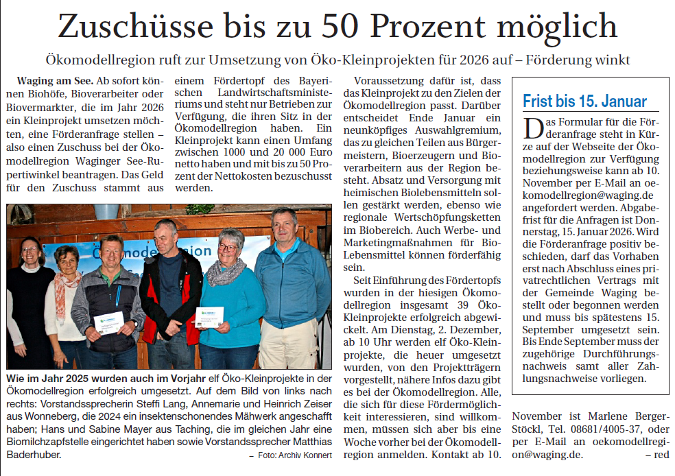 Im Jahr 2025 wurden in der Ökomodellregion Waginger See-Rupertiwinkel elf Öko-Kleinprojekte umgesetzt und aus dem „Verfügungsrahmen“ gefördert. Die beteiligten Betriebe stellen ihr gefördertes Kleinprojekt vor und bekommen ihr Förderschild überreicht. Wir laden Sie herzlich dazu ein – kommen Sie vorbei, tauschen Sie sich aus. Vielleicht nehmen Sie eine Anregung auf Umsetzung eines eigenen Projekts im Bereich Bio-Erzeugung, -verarbeitung, -vermarktung oder -bewusstseinsbildung mit heim. Förderanfragen für 2026 sind noch bis 15.1.2026 möglich.