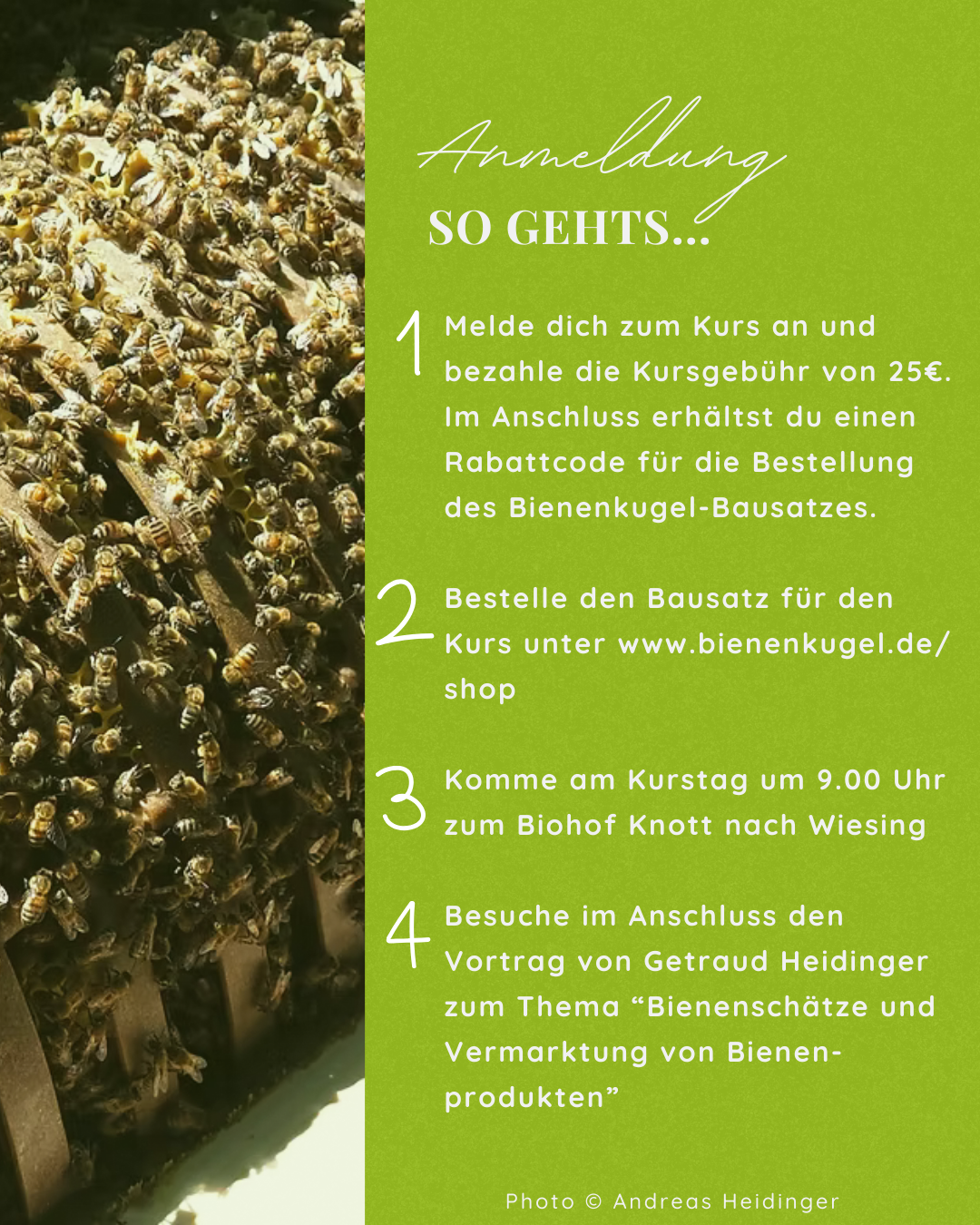- Nach dem Bezahlen der Teilnahmegebühr erhältst du einen Rabattcode für den Einkauf deines Bienenkugel-Bausatzes auf der Seite www.bienenkugel.de/shop.