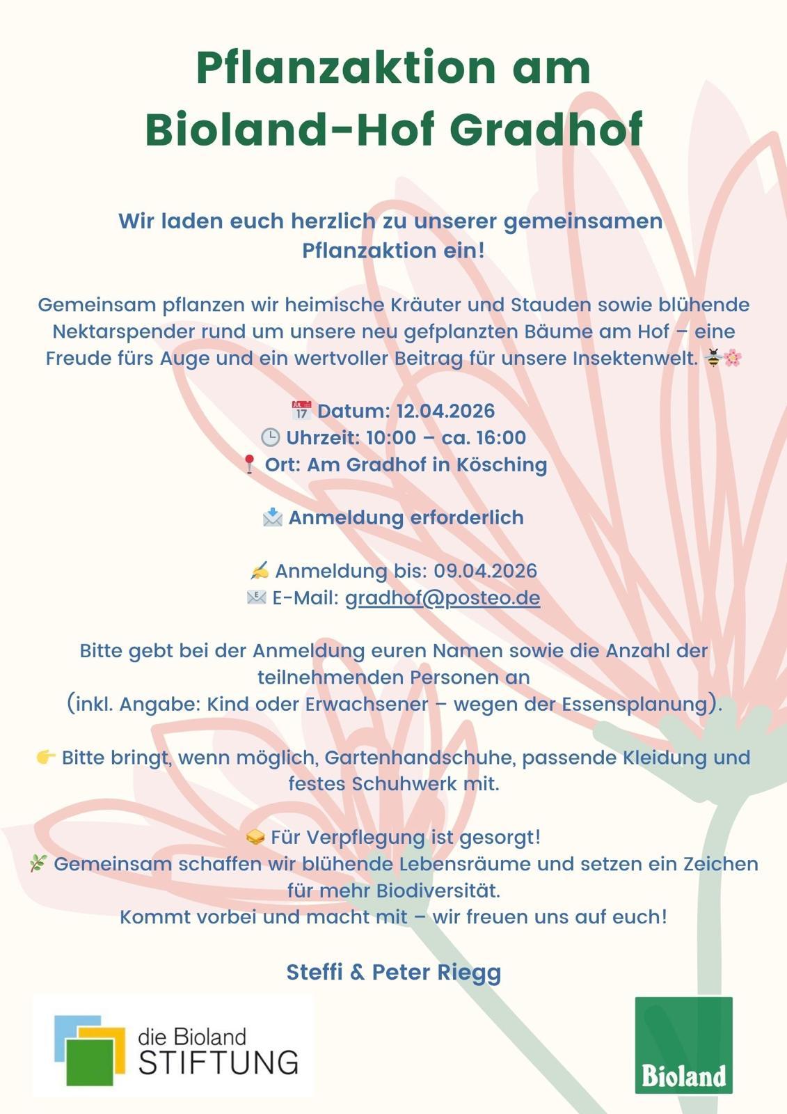 Bitte bringt wenn möglich Gartenhandschuhe, passende Kleidung und festes Schuhwerk mit. Für Verpflegung ist gesorgt, deshalb meldet euch bitte an mit eurem Namen und der Anzahl der teilnehmenden Erwachsenen und Kinder bis 10.4. an.