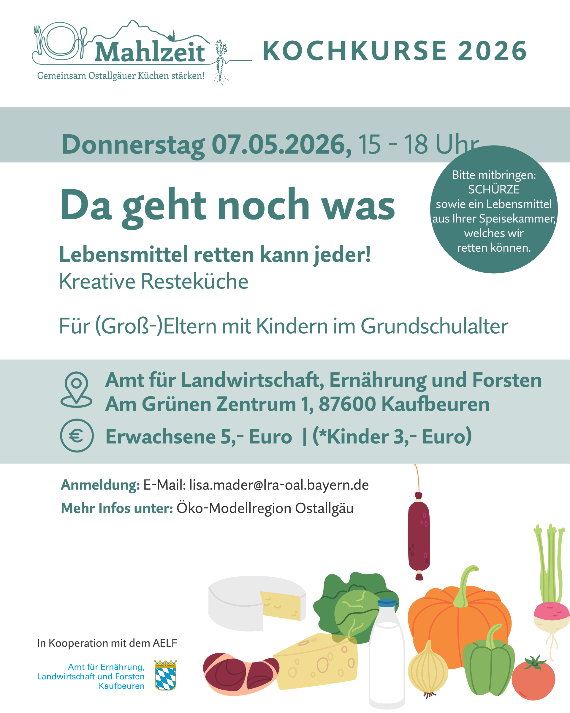 Mit dem Projekt „MAHLZEIT“ stärken wir nachhaltige Ernährung im Ostallgäu und fördern die Wertschätzung für regionale und ökologische Lebensmittel. Gefördert von der Robert Bosch Stiftung im Rahmen des Programms „Zukunft aufgetischt!“, laden wir Bürgerinnen und Bürger gemeinsam mit dem AELF Kaufbeuren zu einer Reihe praxisnaher Kochkurse ein. Ob Resteküche, Brotbacken, Einmachen, Fermentieren oder bewusster Fleischgenuss – hier wird gemeinsam gekocht, Neues entdeckt und regionales Wissen alltagstauglich erlebbar gemacht.